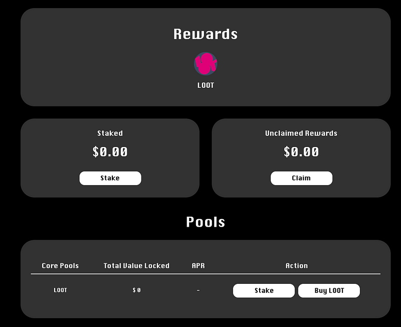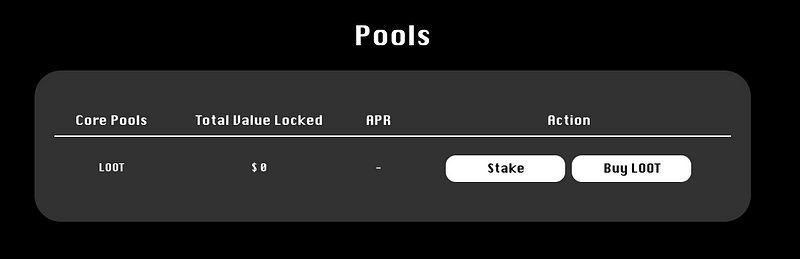 - LOOT/ETH LP → 由 50% $LOOT 和 50% 以太幣組成的流動池。這裡將會接收 80% 的流動性挖礦獎勵。