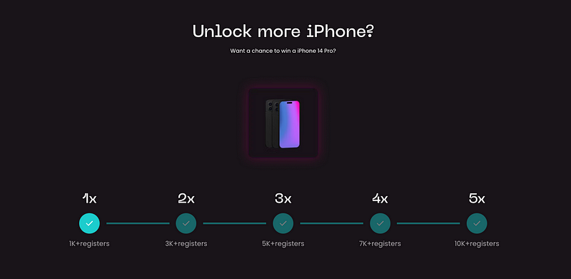 All registered users can have a chance to win an iPhone 14 Pros. The number of available prizes will unlock based on the total number of valid registrations during the alpha period. So the more participants, the bigger the prize pool! It can be up to 5 iPhones!