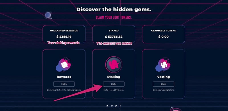 如果您是 LOOT 代幣持有者,以下是質押代幣的詳細步驟。質押智能合約由 Vault.inc 支援,並通過值得信賴的公司 Quantstamp 和 Certik 審計。現在開始跟著示範質押您的代幣吧!