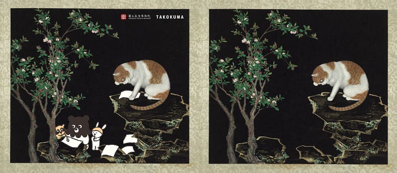 タコクマは< 海棠貍 >の猫の足元で書道をしている。猫と自然環境をテーマとして生命力が溢れる。