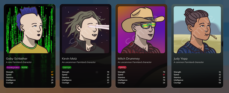 Farmland Character NFTs are the core to the future of Farmland. Players can freely trade their minted NFTs in Lootex. When choosing to mint, there will be a chance to employ characters such as Farmers, Miners, Explorer, Hunters, and more. Only Farmers will be available from launch, enabling each player to employ their character as a Farmer to help manage their corn farms.