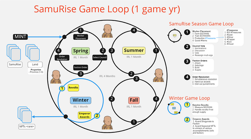 The game design represents the complete Game Loop that takes place for over a year in game terms (4 months IRL terms). The detail here is purposefully lighter because of the target release date of the game across the 2nd and 3rd phases of their roadmap. The goal of Lost Samurise is to coordinate each player with their Factions in order to outwit their enemies and become the first to purify the lands within the game realm. Players will be rewarded abundantly by the Emperor upon the achievement of Seasonal and Lore-based milestones.
